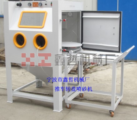 2、加裝活動臺車和轉(zhuǎn)盤,操作時僅需將工件放在臺車轉(zhuǎn)盤上,然后將工件推入機(jī)內(nèi)即可從事噴砂作業(yè),十分簡單省力,可加裝定時加熱器防止玻璃珠 受潮。